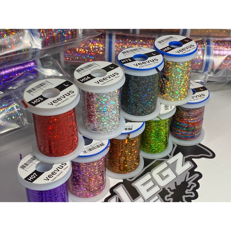 Veevus Holographic Tinsel is ultra strong and does not loose it’s color when stretched. Additionally you get 30 meters on a small spool 20m on a medium and 11 on a large spool. Colors and quantity are the best we have seen in a holographic tinsel.