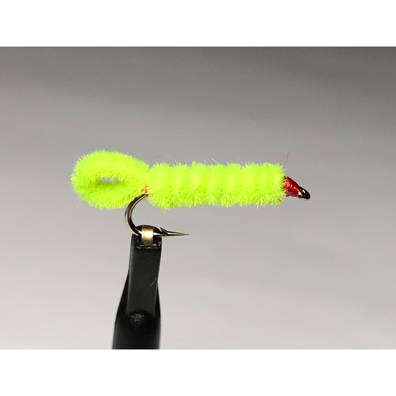This pattern in chartreuse can look like an inch worm in the water or is used as an attractor pattern in pink or chartreuse and is one of our favorites.