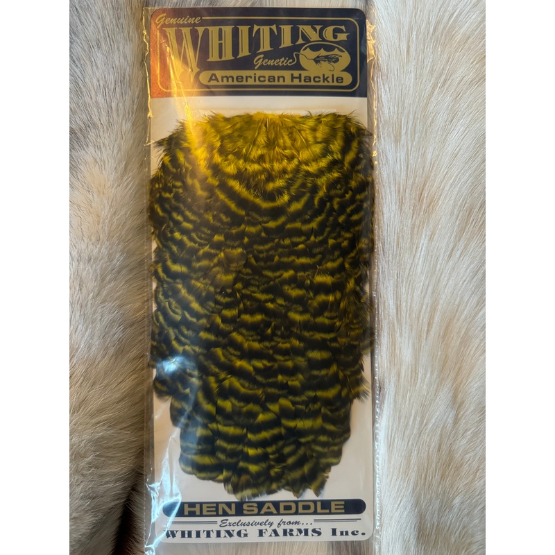 combine these great tying attributes with an unequaled array of natural and expertly dyed colours and the versatility of the Whiting Farms American hen saddle becomes almost limitless. In addition several novel colour patterns have been genetically incorporated into this line of birds to offer unique highlighting and markings for your flies. In particular the definition to the feather or when wrapped adds black yips to the hackle collars. Separately or together these laced markings add dramatic accents to your flies and may inspire whole new fly patterns.