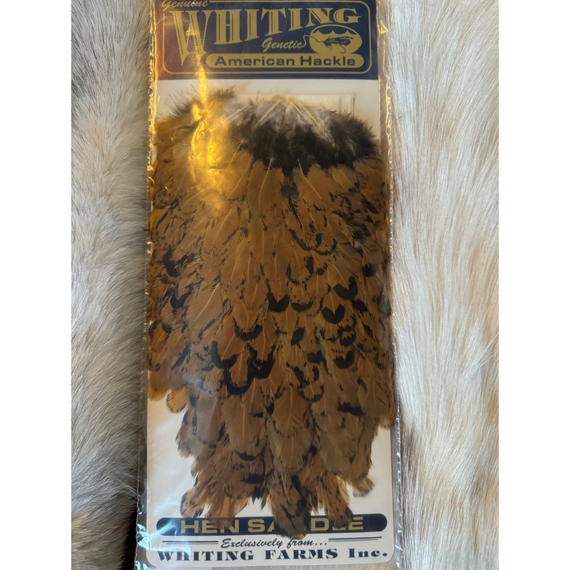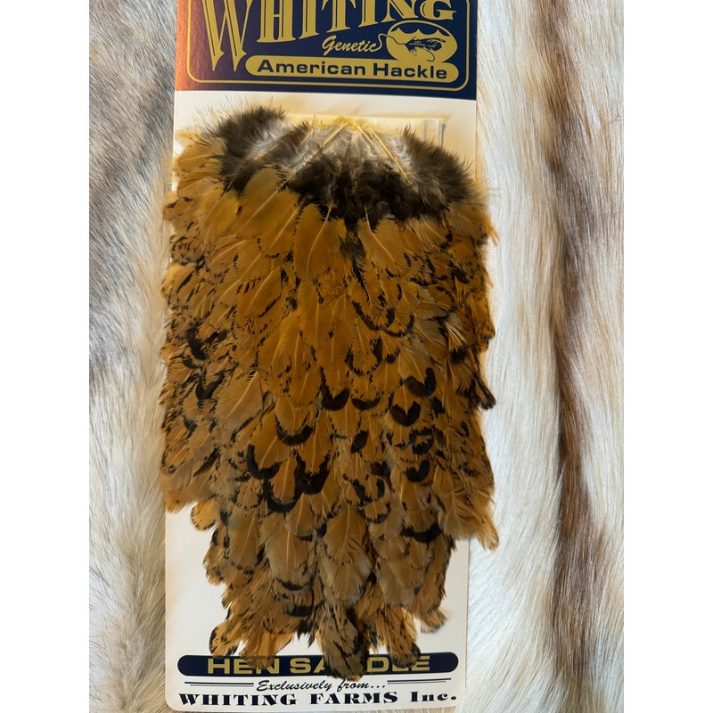 combine these great tying attributes with an unequaled array of natural and expertly dyed colours and the versatility of the Whiting Farms American hen saddle becomes almost limitless. In addition several novel colour patterns have been genetically incorporated into this line of birds to offer unique highlighting and markings for your flies. In particular the definition to the feather or when wrapped adds black yips to the hackle collars. Separately or together these laced markings add dramatic accents to your flies and may inspire whole new fly patterns.