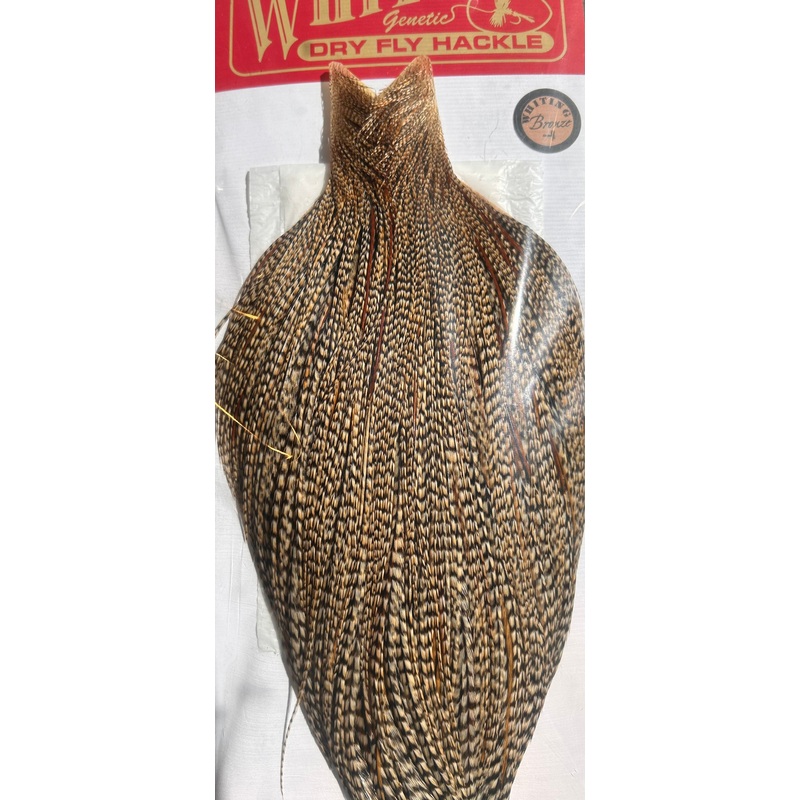 Whiting dry fly capes aretheultimate in dry fly tying. With long supple quills and incredible barb density capable of tying down to size 24 and even smaller, Whiting genetic dry fly hackle is the connoisseurs choice for fly tying. This product line derives its heritage from the legendary Hoffman grizzly super hackle stock. Only Whiting Farms has this incredible genetic stock to offer you.