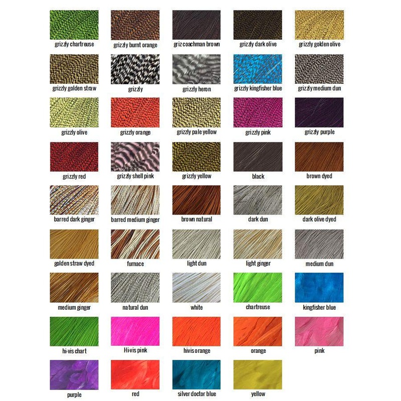 The Bronze level of the Whiting Farms Dry Fly Hackles are some ofthe stiffest, most dense barb count on the supplest of quills, the Whiting line of capes and saddles are the preferred choice of dry fly tiers around the world