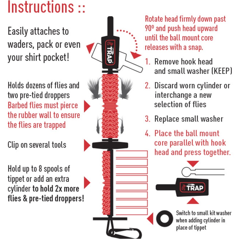 FLY TRAP XLT– Just like the original FLY TRAP FT1, with the addition of a tippet leash that can hold up to 8-spools of tippet material. Holds flies, tools and tippet all in one conveniently in one spot! Clips to any D-ring or accessory loop on vests or packs.